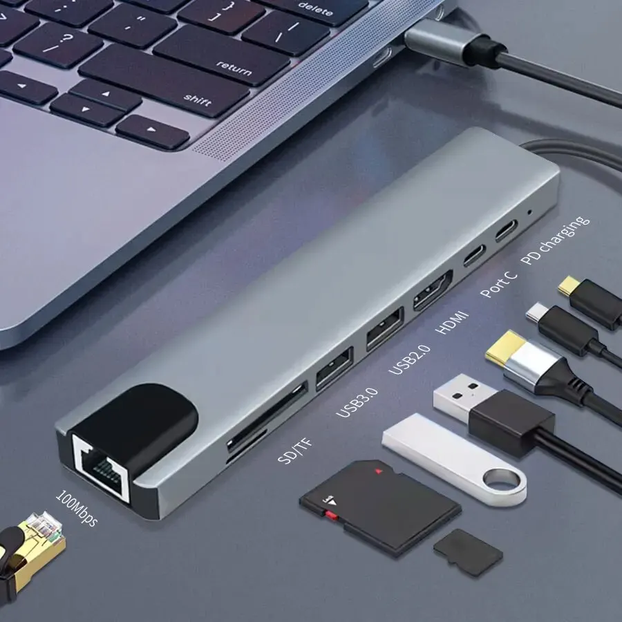 USB C Hub 8 in 1 Type C 3.1 to 4K HDMI Adapter with RJ45 SD/TF Card Reader PD Fast Charge for Macbook Notebook Laptop Computer