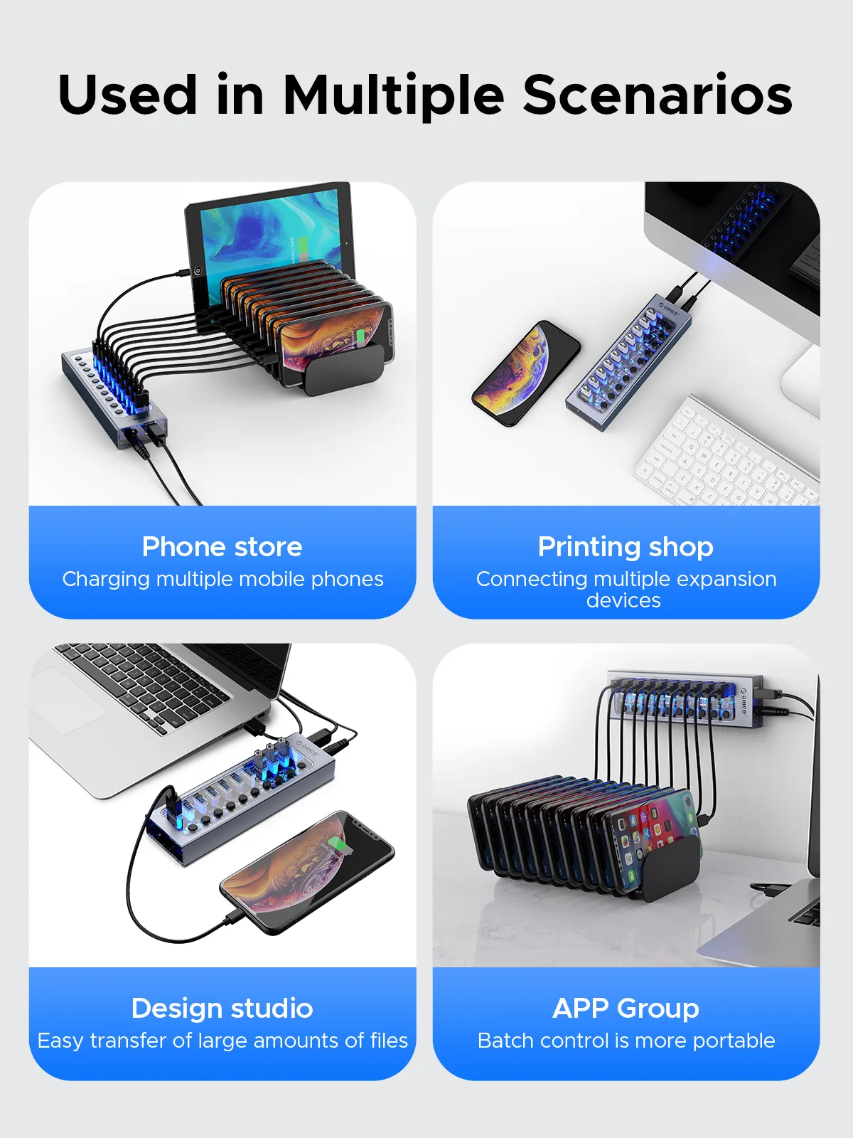 USB3.0 Hub Aluminum Industrial 7-Port Splitter Split Switch with 12V Power Adapter for Macbook Mobile Phone Tablets